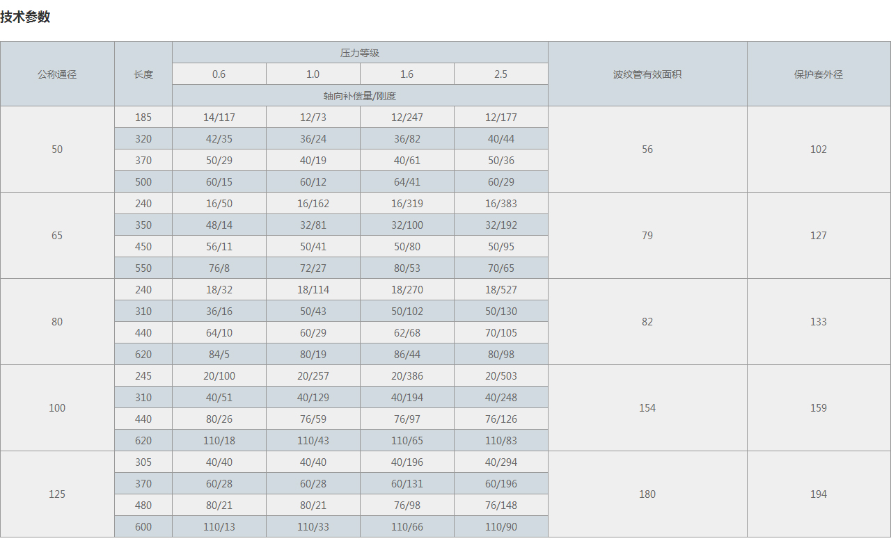 | 公稱通徑 | 長(zhǎng)度 | 壓力等級(jí) | 波紋管有效面積 | 保護(hù)套外徑 | |||