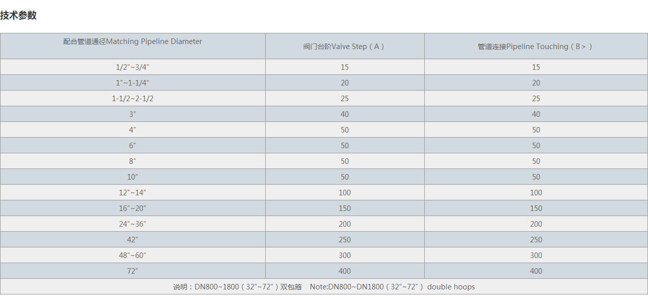 | 配合管道通徑Matching Pipeline Diameter | 閥門臺階Valve Step(A) | 管道連接Pipeline Touching(B>) |