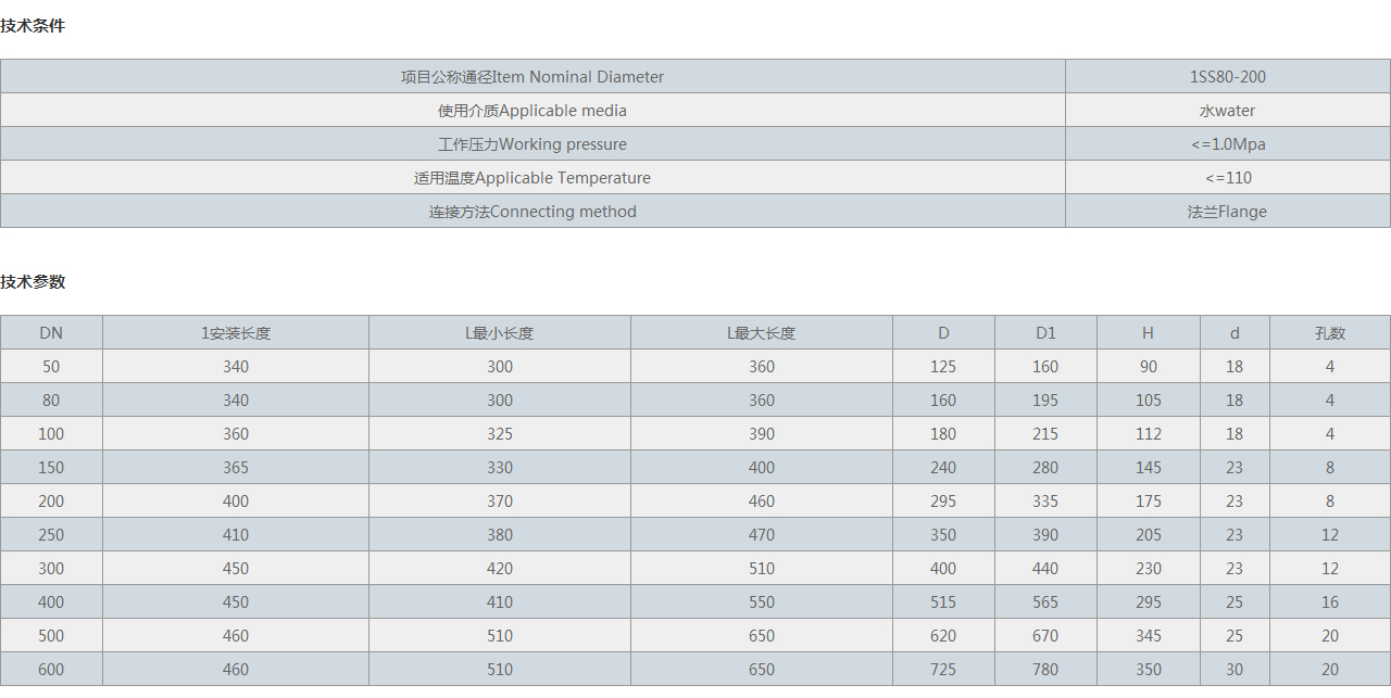 技術條件| 項目公稱通徑Item Nominal Diameter | 1SS80-200 |