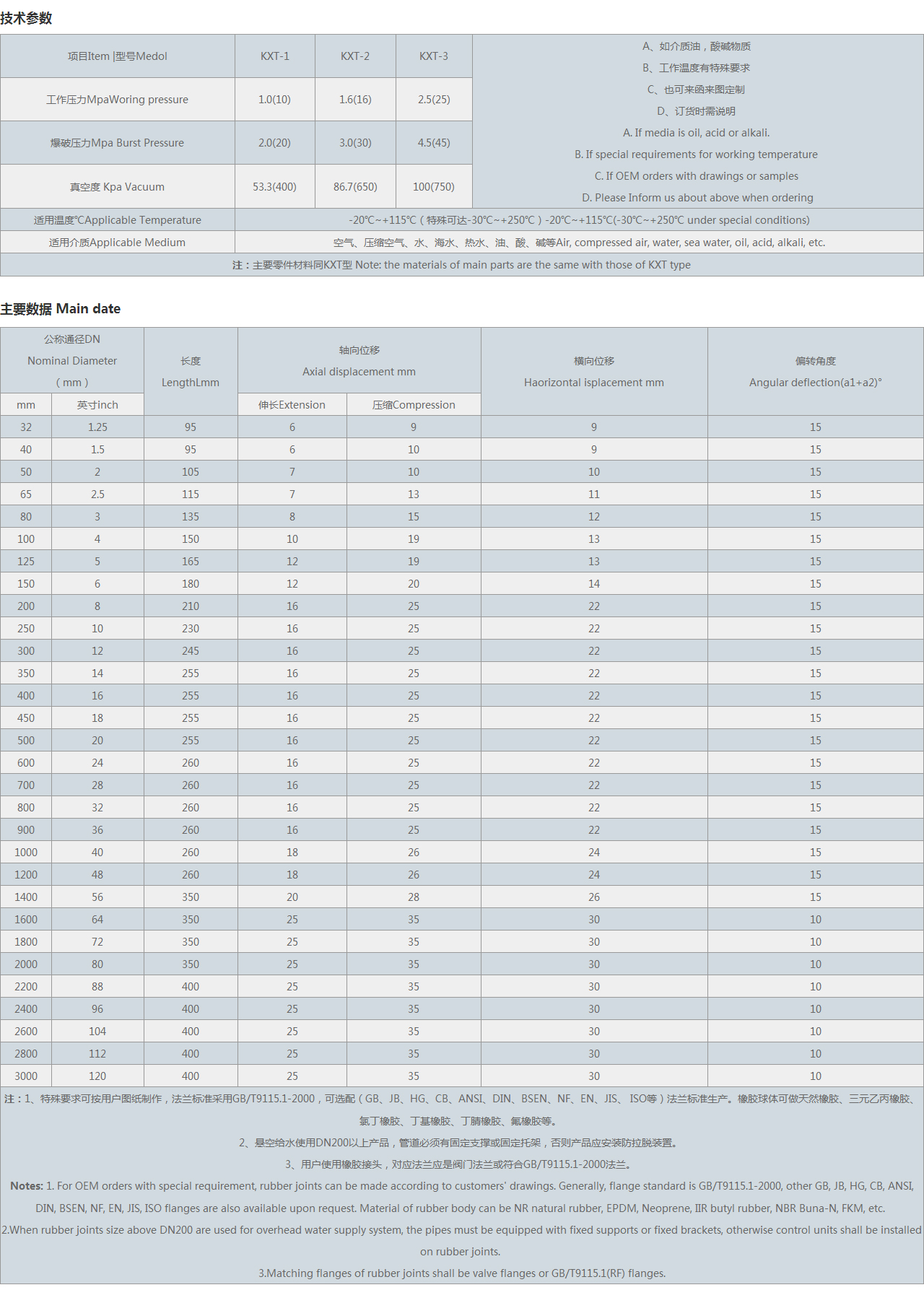| 注:1、特殊要求可按用戶圖紙制作,可選配(GB、JB、HG、CB、ANSI、DIN、BSEN、NF、EN、JIS、 等)法蘭標(biāo)準(zhǔn)生產(chǎn)。橡膠球體可做天然橡膠、三元乙丙橡膠、氯丁橡膠、丁基橡膠、丁腈橡膠、氟橡膠等。 2、懸空給水使用DN200以上產(chǎn)品,管道必須有固定支撐或固定托架,否則產(chǎn)品應(yīng)安裝防拉脫裝置。 3、用戶使用橡膠接頭,對應(yīng)法蘭應(yīng)是閥門法蘭。 Notes: 1. For OEM orders with special requirement, rubber joints can be made according to customers' drawings. Generally, flange standard is, other GB, JB, HG, CB, ANSI, DIN, BSEN, NF, EN, JIS, flanges are also available upon request. Material of rubber body can be NR natural rubber, EPDM, Neoprene, IIR butyl rubber, NBR Buna-N, FKM, etc. 2.When rubber joints size above DN200 are used for overhead water supply system, the pipes must be equipped with fixed supports or fixed brackets, otherwise control units shall be installed on rubber joints. 3.Matching flanges of rubber joints shall be valve flanges or flanges. |