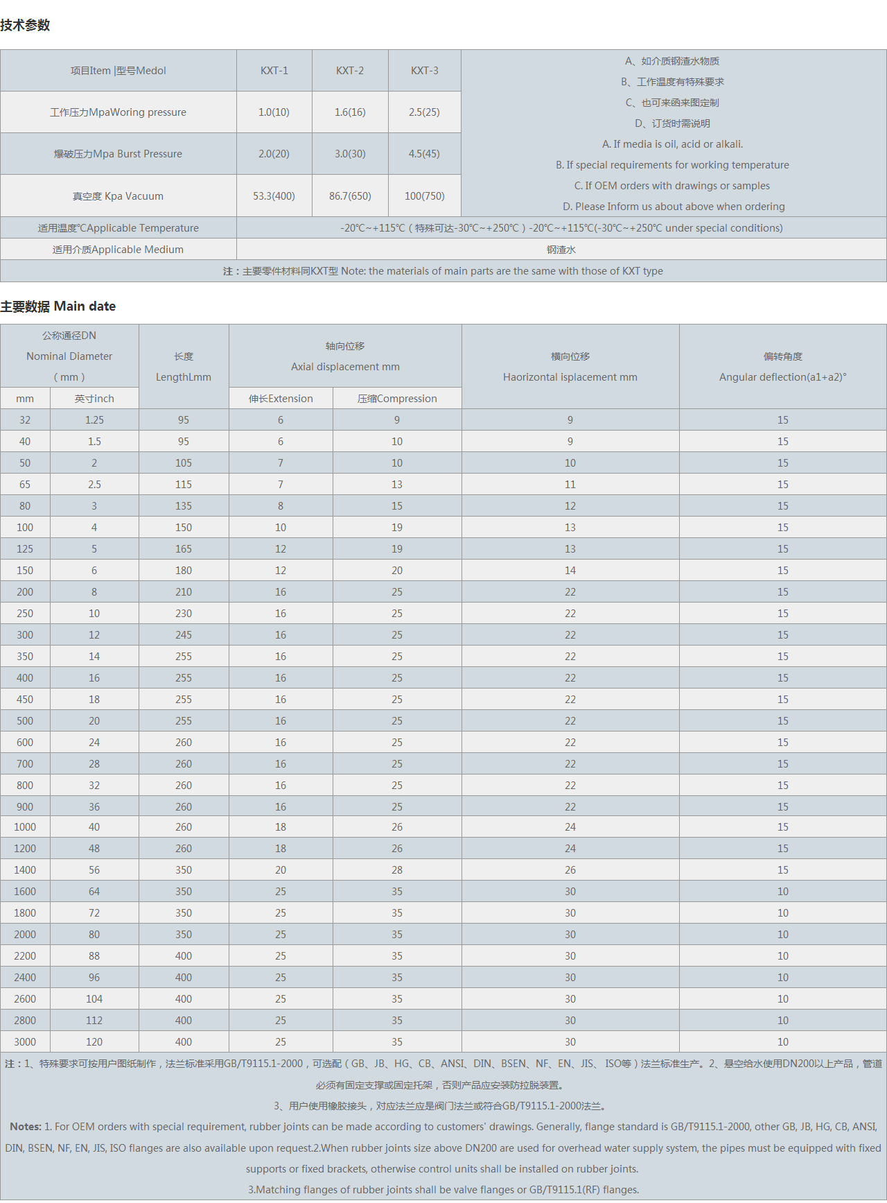 | 注:1、特殊要求可按用戶圖紙制作,可選配(GB、JB、HG、CB、ANSI、DIN、BSEN、NF、EN、JIS、 等)法蘭標(biāo)準(zhǔn)生產(chǎn)。2、懸空給水使用DN200以上產(chǎn)品,管道必須有固定支撐或固定托架,否則產(chǎn)品應(yīng)安裝防拉脫裝置。 3、用戶使用橡膠接頭,對(duì)應(yīng)法蘭應(yīng)是閥門法蘭。 Notes:1. For OEM orders with special requirement, rubber joints can be made according to customers' drawings. Generally, flange standard is , other GB, JB, HG, CB, ANSI, DIN, BSEN, NF, EN, JIS, flanges are also available upon request. 2.When rubber joints size above DN200 are used for overhead water supply system, the pipes must be equipped with fixed supports or fixed brackets, otherwise control units shall be installed on rubber joints. 3.Matching flanges of rubber joints shall be valve flanges or flanges. |